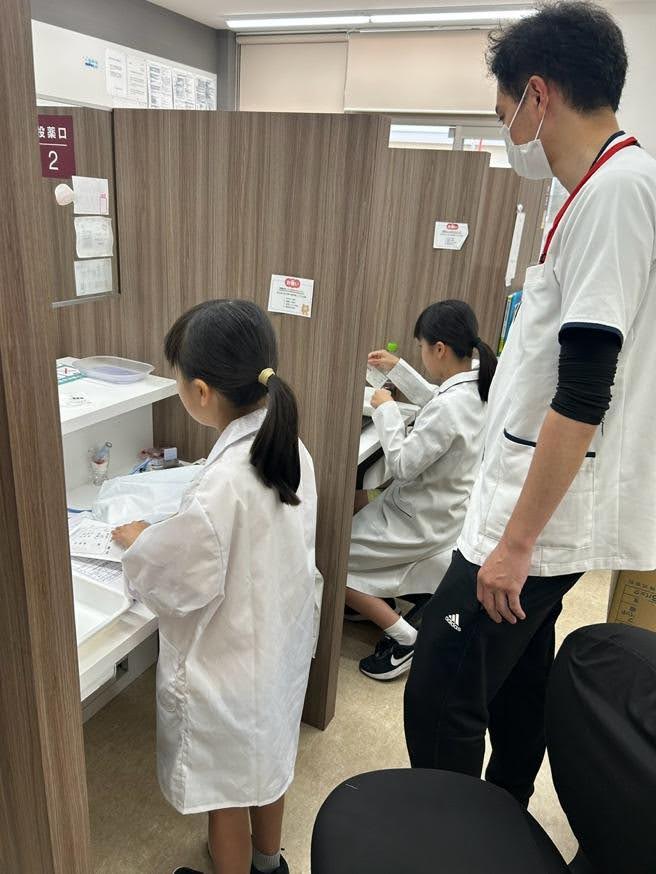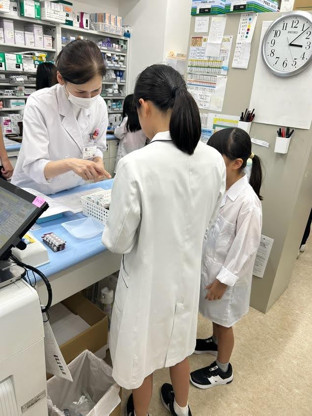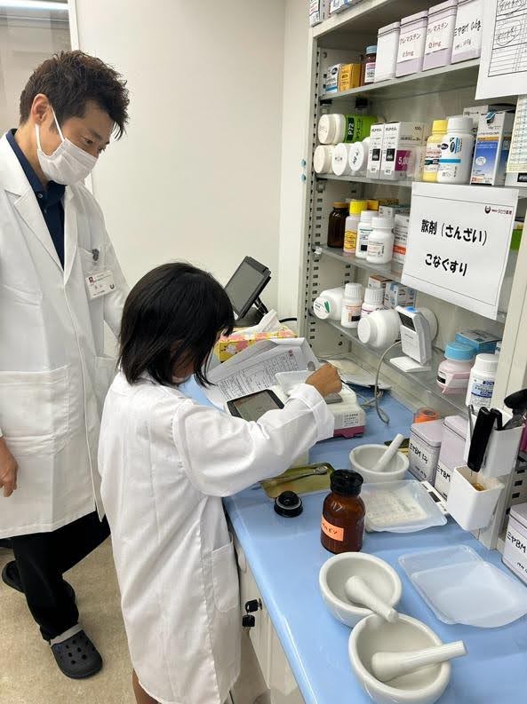 2025年8月7日 こども調剤イベント 投薬体験を行いました。自分で作った粉薬と軟膏、一包化の薬をお母さんに投薬。うまくできたかな?